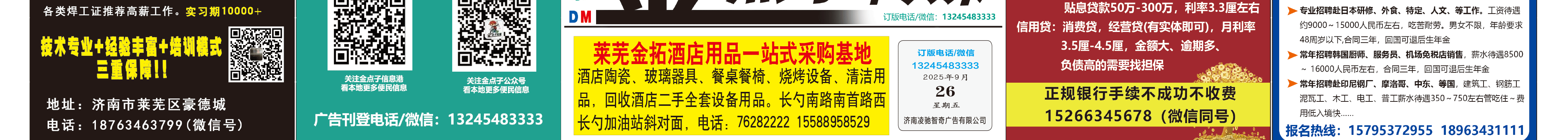 《莱芜金点子广告》报纸9月26日一、二版 http://www.jindianzi.net 发布日期:2025/9/26 9:13:02 文章作者:莱芜金点子信息港